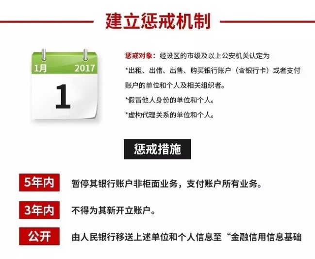(三)建立对买卖银行账户和支付账户、冒名开户的惩戒机制。自2017年1月1日起,银行和支付机构对经设区的市级及以上公安机关认定的出租、出借、出售、购买银行账户(含银行卡,下同)或者支付账户的单位和个人及相关组织者,假冒他人身份或者虚构代理关系开立银行账户或者支付账户的单位和个人,5年内暂停其银行账户非柜面业务、支付账户所有业务,3年内不得为其新开立账户。人民银行将上述单位和个人信息移送金融信用信息基础数据库并向社会公布。