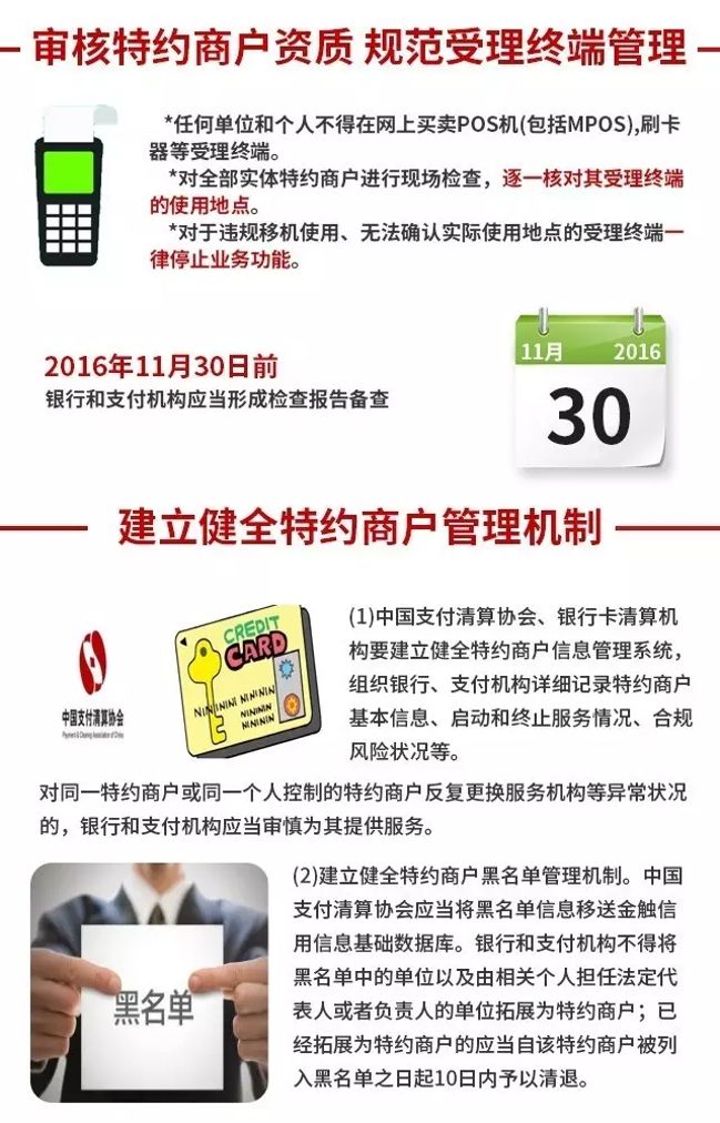 (十三)严格审核特约商户资质,规范受理终端管理。任何单位和个人不得在网上买卖POS机(包括MPOS)、刷卡器等受理终端。银行和支付机构应当对全部实体特约商户进行现场检查,逐一核对其受理终端的使用地点。对于违规移机使用、无法确认实际使用地点的受理终端一律停止业务功能。银行和支付机构应当于2016年11月30日前形成检查报告备查。